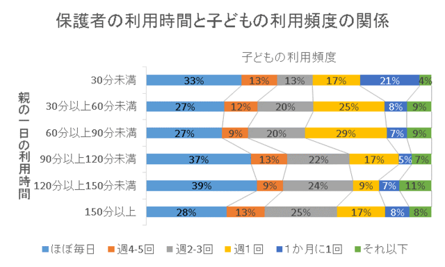 パパママの利用時間と、子どもの利用頻度・時間との関連性を調査してみたところ、親の一日の利用時間の多寡に伴う目立った差異は見られませんでした。
