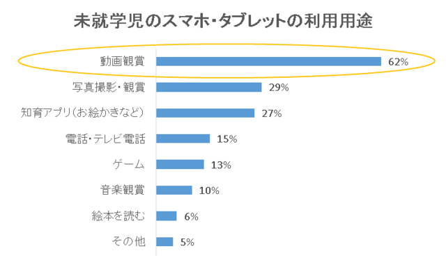 利用用途について聞いてみたところ、「動画観賞」(62%)が圧倒的。次いで「写真撮影・観賞」(29%)が入り、以下「知覚アプリ(お絵かきなど)」(27%)、「電話・テレビ電話」(15%)と続きました。