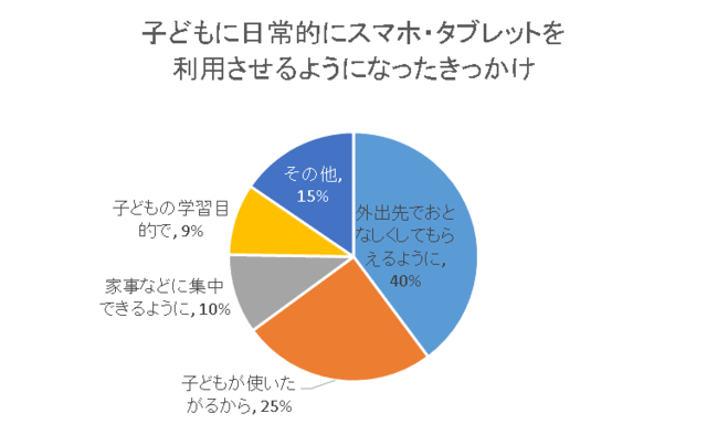 子どもに日常的にスマホ・タブレットを利用させるようになったきっかけを聞いたところ、「外出先でおとなしくしてもらえるように」渡したことが、40%で最も多く票を集めました。