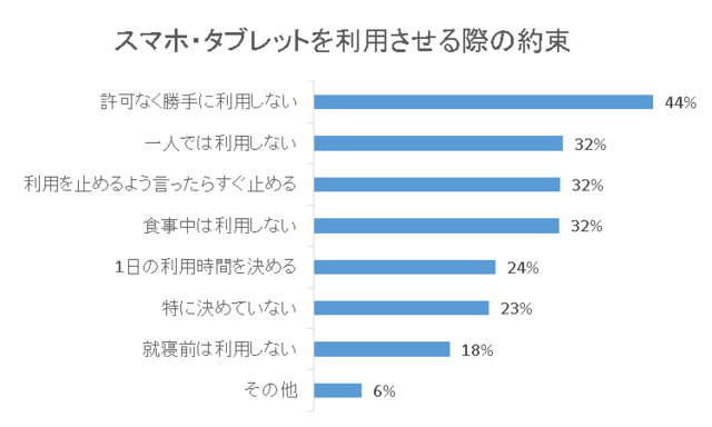 子どもに利用させる際にどのようなルールを親子の約束として決めているのか聞いてみたところ、「許可なく利用しない」が44%で最も多いことがわかりました。