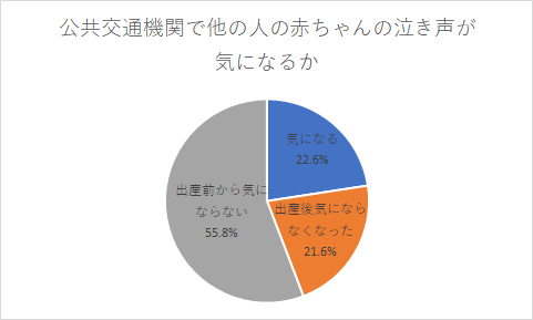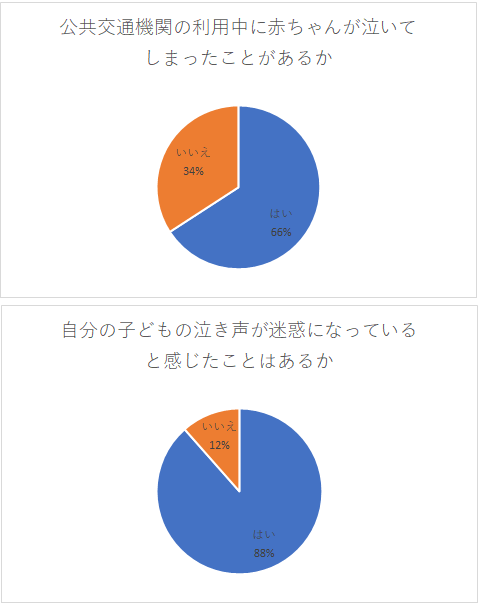 公共交通機関を利用する際、赤ちゃんが泣いてしまったことがあるかについては、66%の方が「はい」と回答しました。