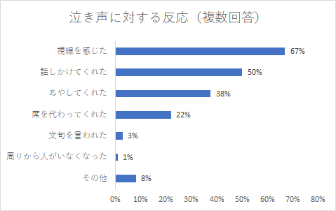 「さまざまな工夫をしても、泣いてしまうときは仕方ない」という声が多かったです。泣くことをどう防ぐかよりも、泣いてしまった時にどうするかを考えて利用することが重要なようです。
