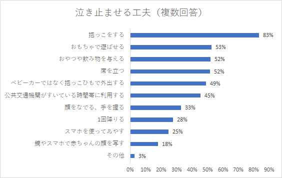 赤ちゃんを泣き止ませるための工夫については、「抱っこをする」が83%、「おもちゃで遊ばせる」、「おやつや飲み物を与える」、「席を立つ」が50%以上となりました。