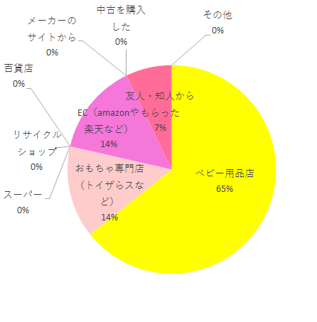 購入方法は「ベビー用品店」が65%で最も多く回答を集めました。やはり実際にお店に足を運んで、店員さんの説明を受けながら自分の目で見極めたいという方が多いようです。