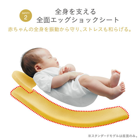 「スゴカルα」はこのエッグショックを赤ちゃんの頭に当たる部分に使用することで、産まれたてのとても繊細な赤ちゃんの頭を、わずかな振動からもしっかりガード!