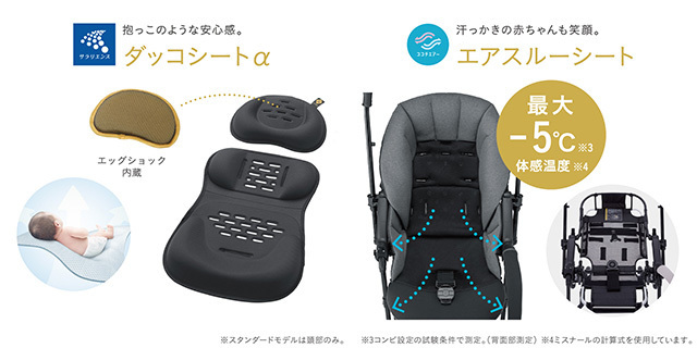 出典:www.combi.co.jp赤ちゃんの快適性を考えた機能が、吸水速乾素材のダッコシートαと通気性のよいエアスルーシート。