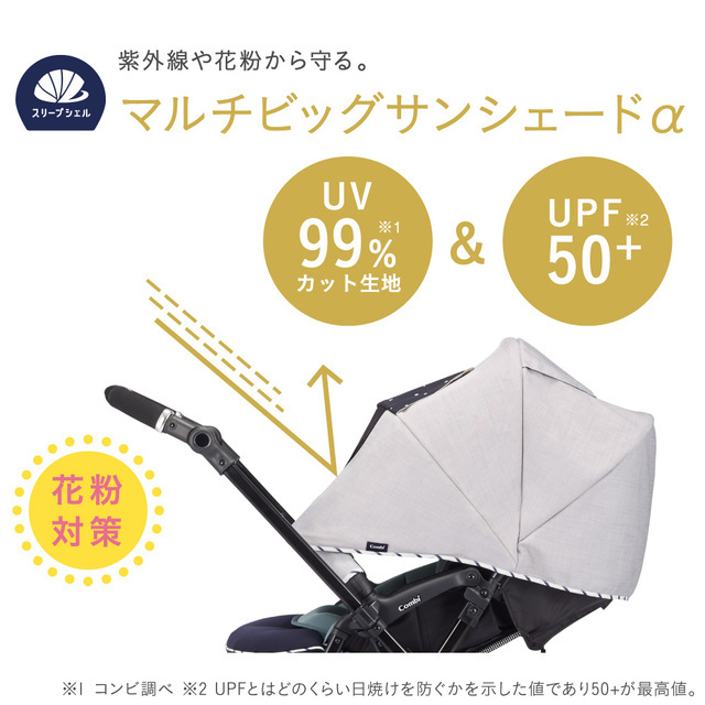 出典:www.combi.co.jpさらに、花粉がつきにくい幌生地は、UVカット99%・遮光率も99%(※1)と高機能!