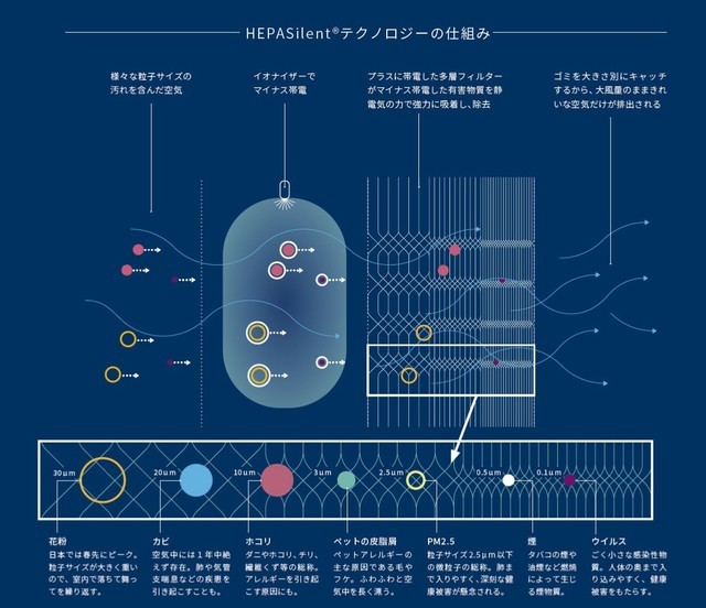 出典:www.blueair.jp空気の汚れで代表的な花粉は約30μm、ホコリは約10μm、タバコの煙は約0.5μmです。対してウイルスは0.1μmほどと言われています。