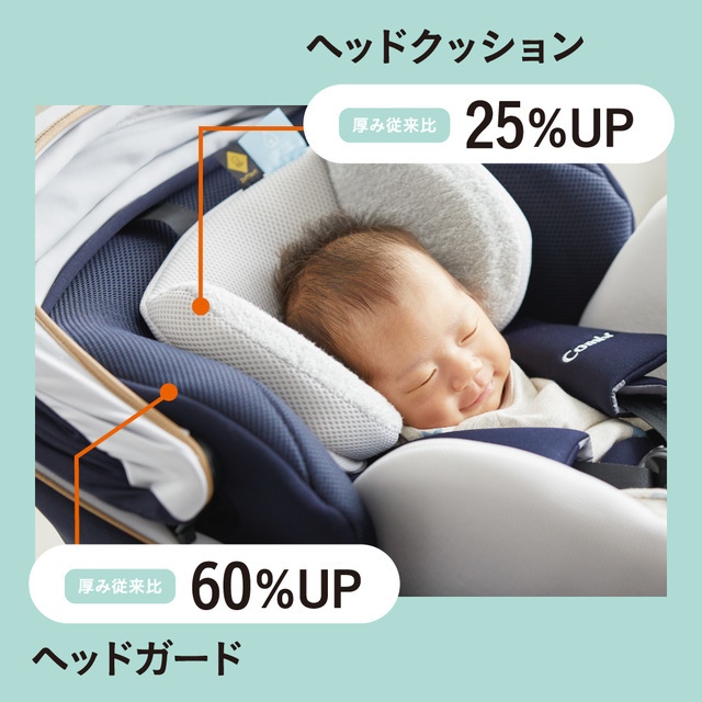 ヘッドクッションも従来品より25%肉厚にすることで、赤ちゃんの首筋から頭部にかけて優しくフィット!ふわふわクッションが赤ちゃんをやさしく包み込み、安全で心地よいドライブを実現します。