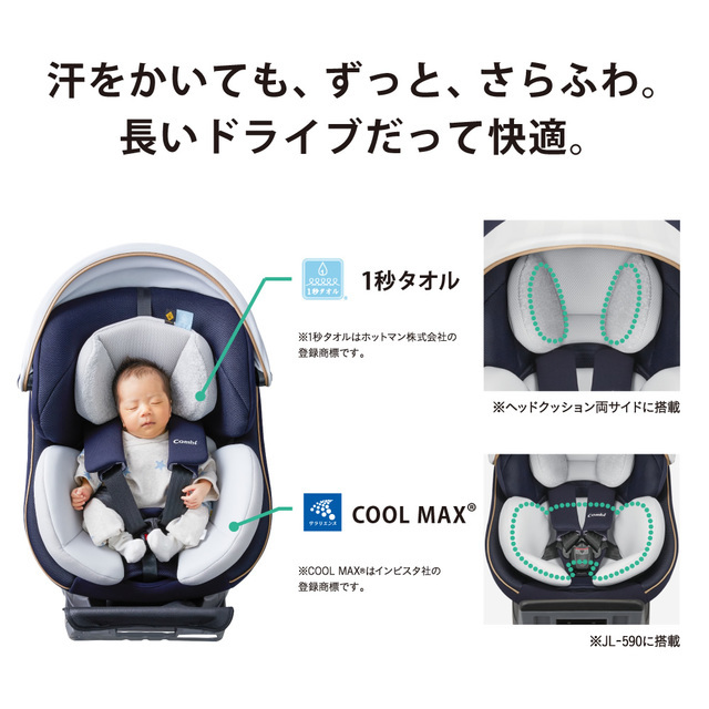 出典:www.combi.co.jpさらに吸水性抜群の1秒タオル※1や、吸水速乾素材の「COOL MAX®」※2がムレを防いでいつもさらふわな心地よさに!
