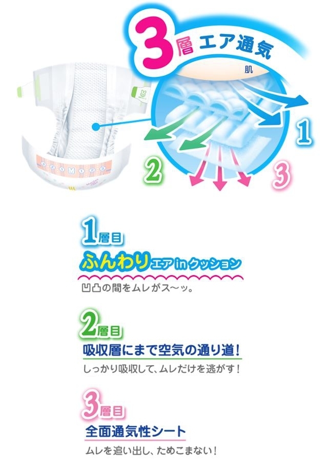 おむつかぶれの原因のひとつ「ムレ」を追い出す!通気性バツグンの3層構造
