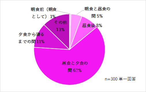 アンケート結果によると、昼食と夕食の間に集中しています。子どものお昼寝している間に、甘いものについ手が…の時間でもあります。