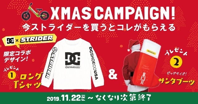 対象商品のベイビーバンドル、ストライダー12インチ、ストライダー14Xを購入すると、限定コラボデザインのロングTシャツ、ビッグサイズのサンタブーツ、ライダーズ グローブなどプレゼントがもらえます!(無くなり次第終了)