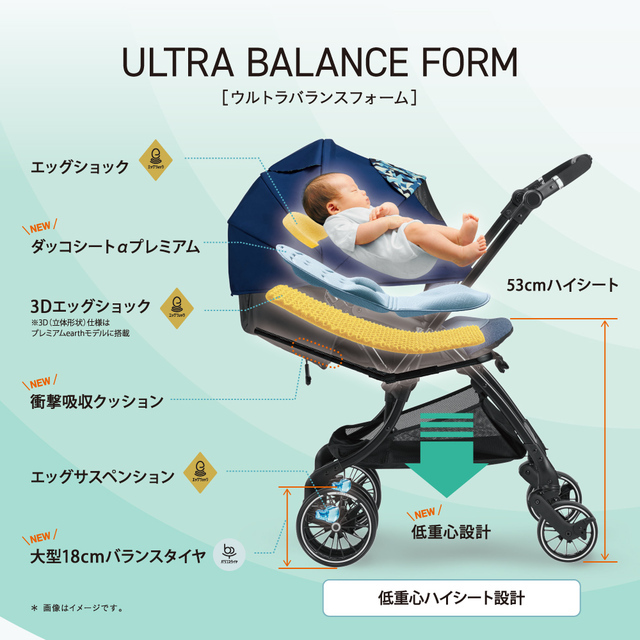 「3Dエッグショックシート」に加え、新たに搭載された「ダッコシートαプレミアム」と「安定ポジション」で、従来品に比べて赤ちゃんの体圧分散効果をグーンとアップ!