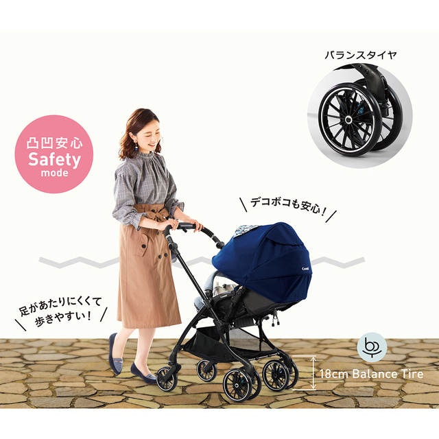 出典:www.combi.co.jp月齢がまだ小さい時期は、デコボコ道でも安心の大型バランスタイヤが前方にくる「凹凸安心 Safety mode」。