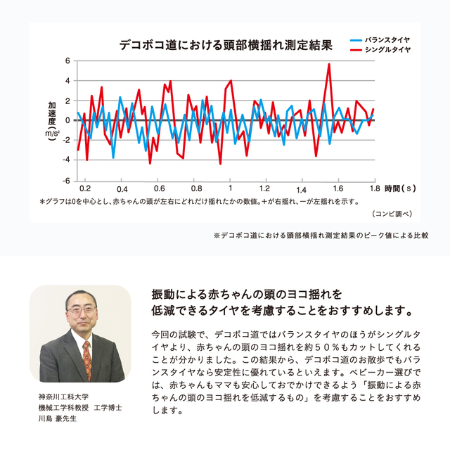 バランスタイヤは、シングルタイヤに比べて赤ちゃんの頭部に伝わるヨコ揺れを約50%※もカット!