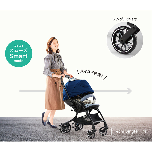 スムーズに押せて、小回りが利きやすいシングルタイヤで、赤ちゃんが大きくなってもアクティブにおでかけできますよ。