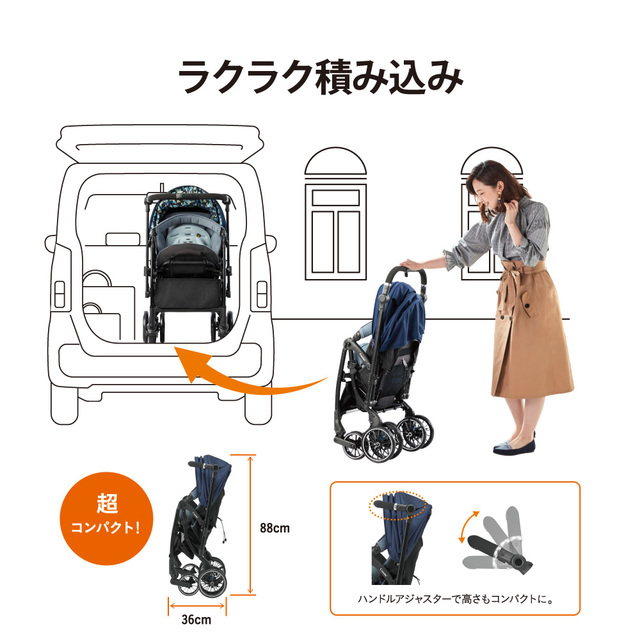 コンパクトかつ軽いので、ママひとりでの車への積み込みもラクラクです。