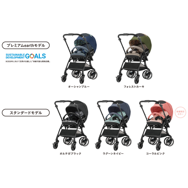 機能充実のプレミアムearthモデルは、オーシャンブルーとフォレストカーキ。幌表生地にPET再生生地を活用し環境にも配慮しています。