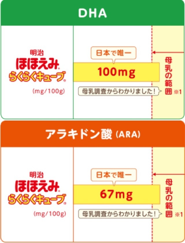 特に、赤ちゃんの成長を支える大切なDHA、アラキドン酸についてはいずれも日本で唯一、母乳の範囲まで配合(下図)しているんですよ!