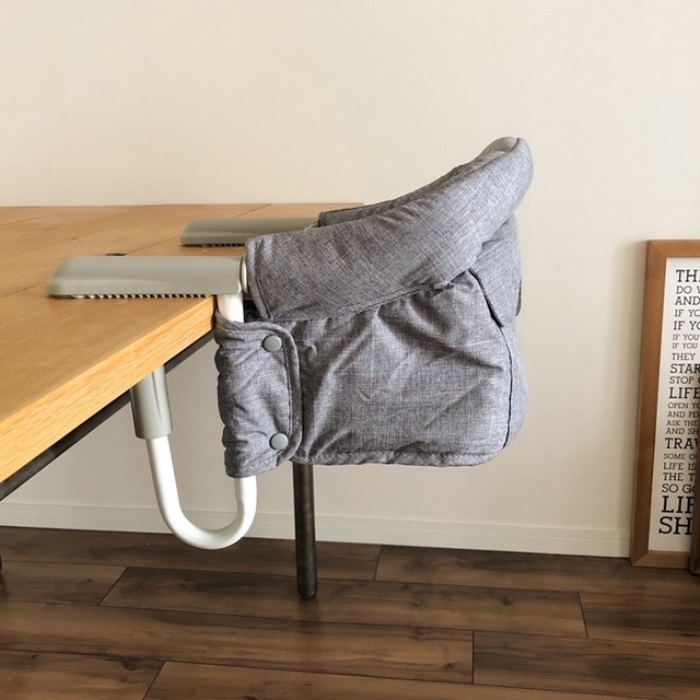 高さのあるテーブルに直接取り付けて使うのがテーブルチェア。床置きしないので場所を取らず、取り外すとコンパクトに持ち運ぶ事ができます。