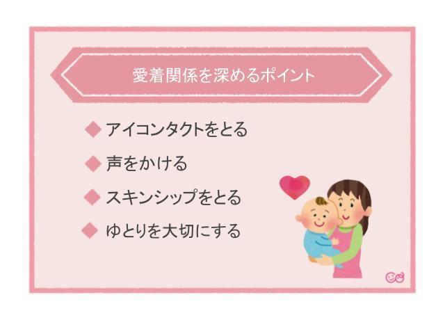 ゆとりを大切にしながら、アイコンタクトや声かけや語りかけ、スキンシップを通じた豊かなふれあいで、お子さんとのこころの絆をたしかに結んでいきましょう。(執筆:臨床心理士)