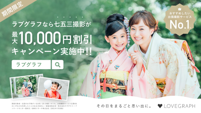 出典:prtimes.jp出張撮影サービス「Lovegraph(ラブグラフ)」を運営する株式会社ラブグラフは、七五三撮影が最大10,000円割引になるキャンペーンをリリースされました。