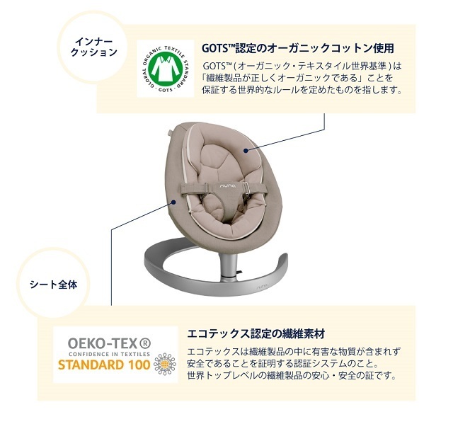エコテックス認定の繊維素材を採用。お子様の肌が触れるインナークッション部分はオーガニックコットンが使われているから、赤ちゃんにやさしい!