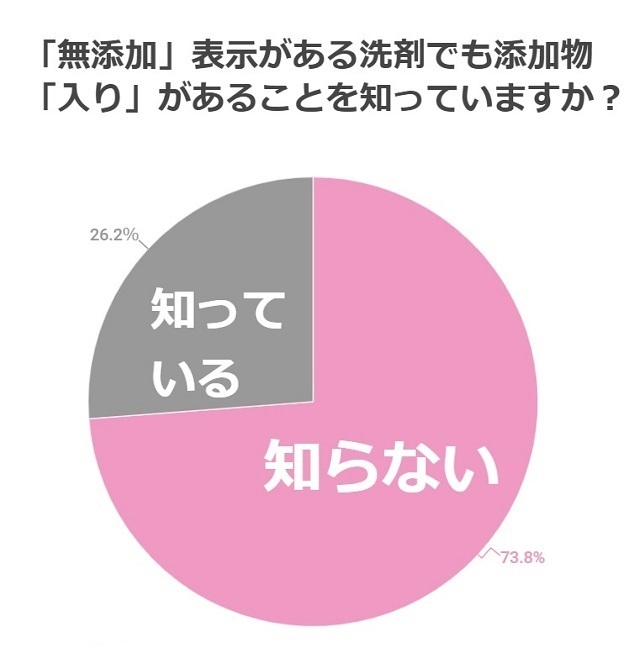 コズレ実施のアンケート調査*で「無添加」という表示がある洗たく洗剤に、添加物が「加えられている場合もある」ことを知っていますか?と尋ねてみたところ、「知らない」と回答された方は73.8%にものぼりました。