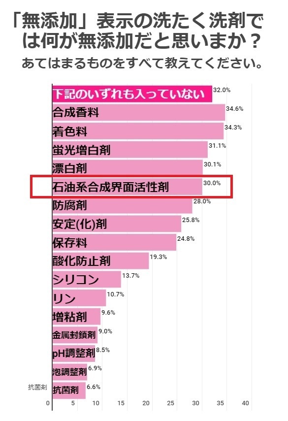 また30%の方が赤ちゃんの肌に強い影響があるとされる石油系の界面活性剤と回答していました。