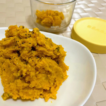 初めてのお肉として、赤ちゃんの内臓への負担が少ないと言われる鶏のささみで作ったメニュー。甘味をプラスするかぼちゃも食べやすいなめらかさに。大人用の取り分けとして、マヨネーズや塩こしょうで味を調えるアレンジも◎