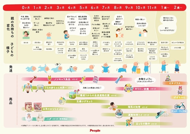 私たちは2021年の終わりに「子どもの発達カレンダー」を作成いたしました。生まれてから2歳頃までのお子様の様子、ママ・パパの気持ちの変化、それに合うおもちゃや育児用品をカレンダーにまとめたものです。お子様のこれからの成長を楽しくイメージしながらご覧いただけると嬉しいです。今回のフェアもカレンダーとリンクしていますし、ダウンロードもできますのでぜひご活用ください