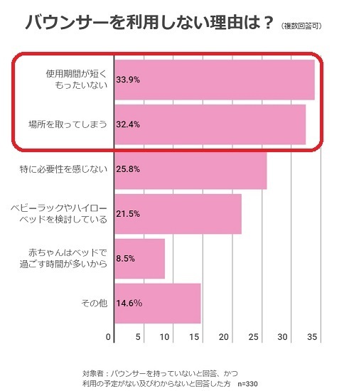 今回コズレが実施したアンケート調査で、バウンサーを利用していない方にその理由を尋ねてみたところ、1位は「使用期間が短くもったいない」、2位が「場所を取ってしまう」という結果でした。