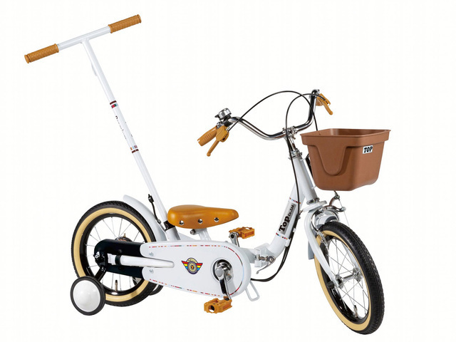 大人が楽な姿勢で自転車を押し、進行方向をコントロールできる「かじとり式 押し手棒」付き。(押し手棒はワンタッチで取り外し可能)