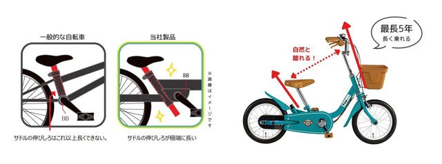 サドルとハンドルの高さと間隔を、子どもの成長に合わせてベストなバランスに調整できる「マルチアジャスト機構」で、最長5年間使用可能です。乗車しやすいハンドル・サドル・ペダルの配置