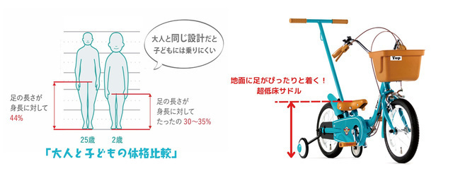子どもの体格に合わせてハンドル・サドル・ペダルの配置を見直し、ペダルの力が効率よく伝わる自然な姿勢で乗車できるので、乗りやすくこぎやすい設計!超低床サドル