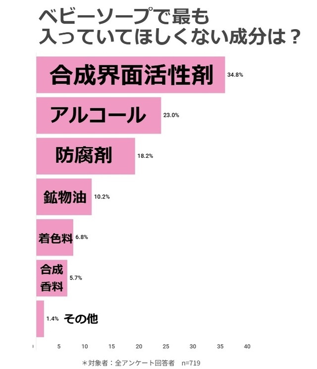 コズレが実施したアンケート*ではおよそ97%が「肌にやさしい」と回答した弱酸性ですが、実は弱酸性のべビーソープの主成分は合成界面活性剤です。だからこそ、何が無添加なのかをちゃんと確認することが大切です。