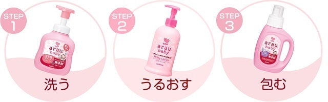 一般的なせっけんだと皮脂を落としすぎてつっぱり感が残ってしまうかもしれませんが、アラウ.ベビー泡全身ソープは独自成分の"肌すこやか成分*”を配合していて、肌本来のうるおいを残しながら、汗や皮脂汚れをしっかり落とす理想の洗い上がり。