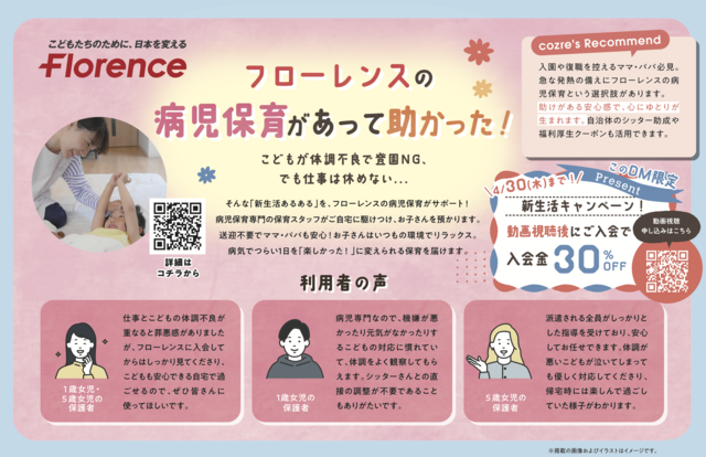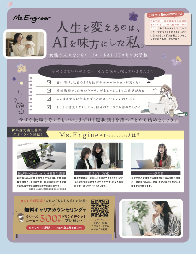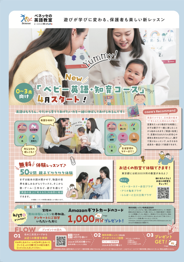 ベネッセビースタジオに0〜3歳向け「ベビー英語・知育コース」が新登場!教室検索はこちらから!保険とNISA、自分にどっちが向いてるか分かるかも!スマートプランニングのオンラインセミナー日程チェック・予約はこちらから!自宅に駆けつけ、親子の「困った」に寄り添う。フローレンスの病児保育動画視聴後のご入会で入会金30%OFF!視聴はこちらからこれからのキャリアの新しい選択肢に、Ms.Engineerの「リモートAI・ITスキル大学校」カウンセリングはLINEからご予約OK!LINE友だち登録はこちらから ・掲載内容や連絡先等は、現在と異なる場合があります。・表示価格は、改正前の消費税率で掲載されている場合があります。ご了承ください。 関連記事 おうち時間を応援します。えにすた提供の習い事サービス【はじめて応援隊】 プレスリリース情報 PR 春からピアノを始めませんか?新生活を応援!春の電子ピアノフェア開催中 プレスリリース情報 PR ひとり親家庭の皆さまを応援! 【WakeAi フードバンク】第一弾をリリース プレスリリース情報 PR 関連するキーワード