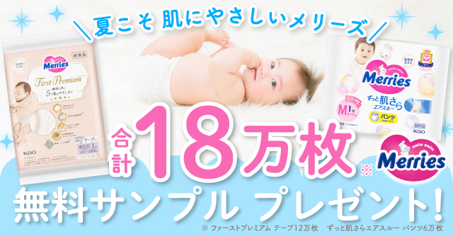 「メリーズファーストプレミアム テープタイプ」または「メリーズ ずっと肌さらエアスルー パンツタイプ」を、抽選で18万枚プレゼントいたします!
